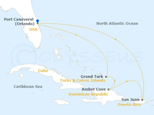 Port Canaveral (Orlando), Florida | San Juan, Puerto Rico | Amber Cove, Dominican Republic | Grand Turk, Turks & Caicos | Port Canaveral (Orlando), Florida