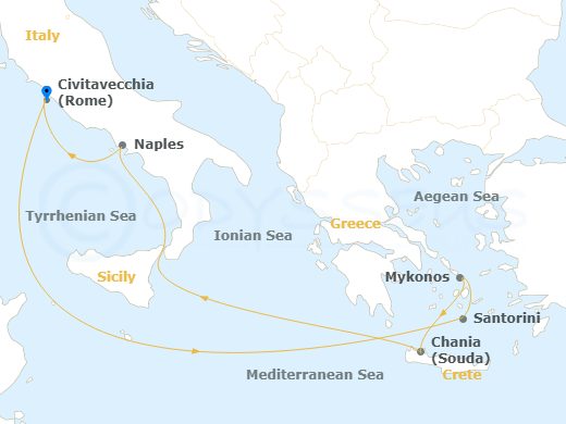 Barcelona, Spain | Valletta, Malta | Chania (Souda),Crete, Greece | Olympia (Katakolon), Greece | Sicily (Messina), Italy | Naples, Italy | Rome (Civitavecchia), Italy | Barcelona, Spain