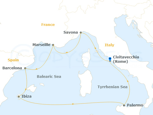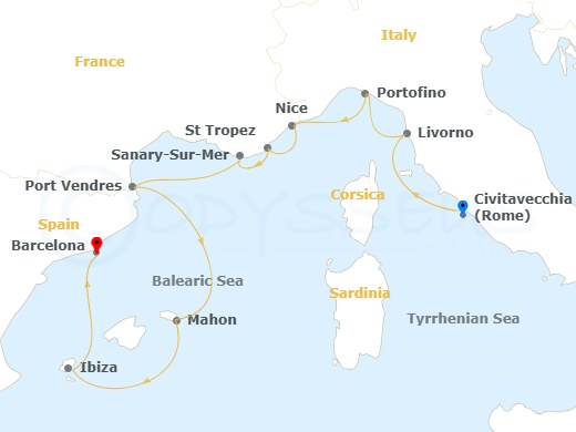 Civitavecchia (Rome) | Livorno (Florence/Pisa) | Portofino | Nice | Saint Tropez | Sanary-Sur-Mer (Bandol) | Port-Vendres | Mahon (Menorca) | Ibiza | Ibiza | Barcelona