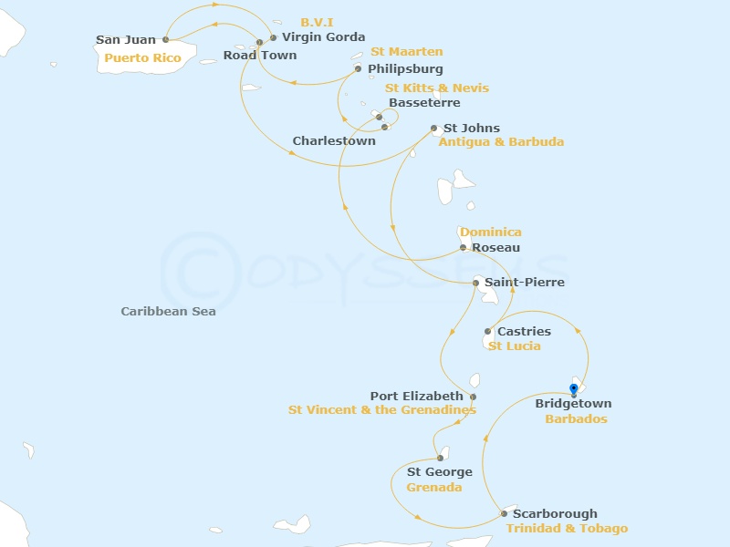 Bridgetown | Castries | Roseau | Basseterre, StKitts | Charlestown, Nevis | Philipsburg | Road Town, Tortola | San Juan | Virgin Gorda | St Johns, Antigua | Saint- Pierre | Port Elizabeth, Bequia | Saint Georges, Grenada | Scarborough, Tobago | Bridgetown