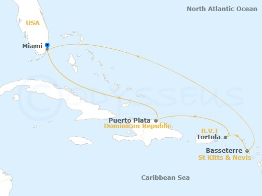 Miami, Florida | Puerto Plata, Dominican Rep | Tortola, BVI | Basseterre, St Kitts & Nevis | Miami, Florida