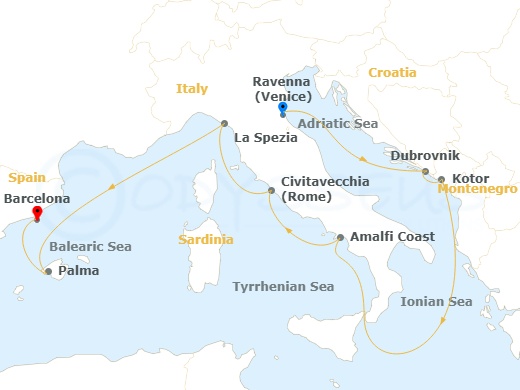 Venice (Ravenna), Italy | Dubrovnik, Croatia | Kotor, Montenegro | Amalfi Coast (Salerno), Italy | Civitavecchia Rome, Italy | La Spezia, Italy | Nice/Monaco (Villefranche), France | Palma Majorca, Spain | Barcelona, Spain